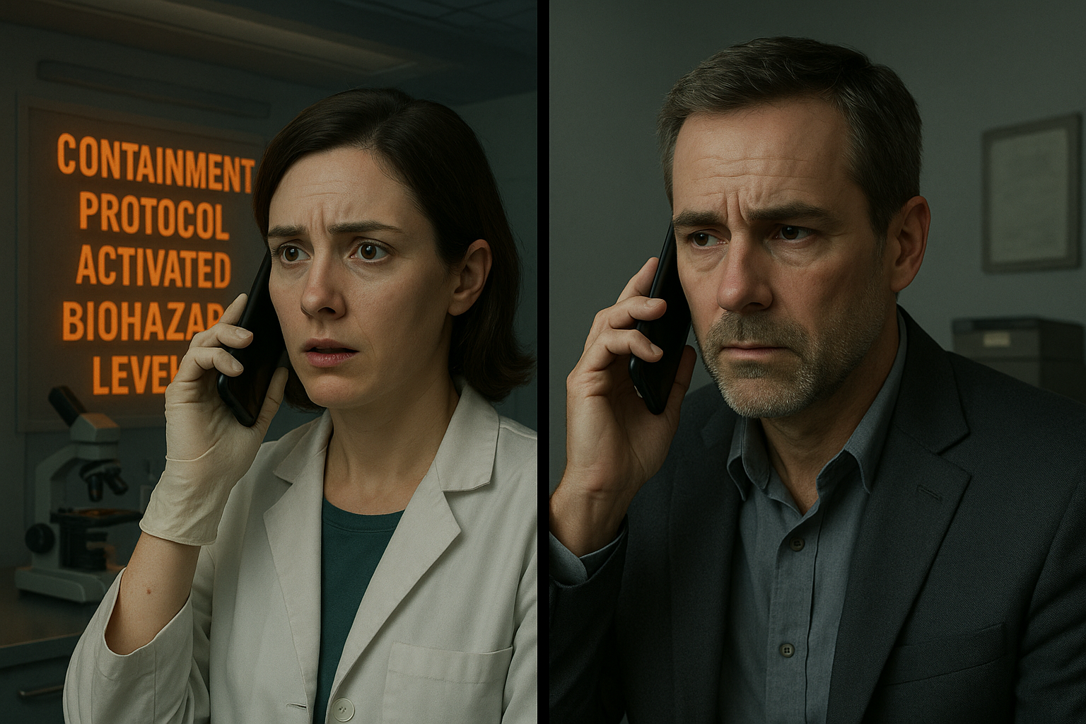 The lab doors hiss as they lock with a mechanical thud. Overhead, the ventilation kicks into overdrive, filtering the air. An automated voice chirps to life: